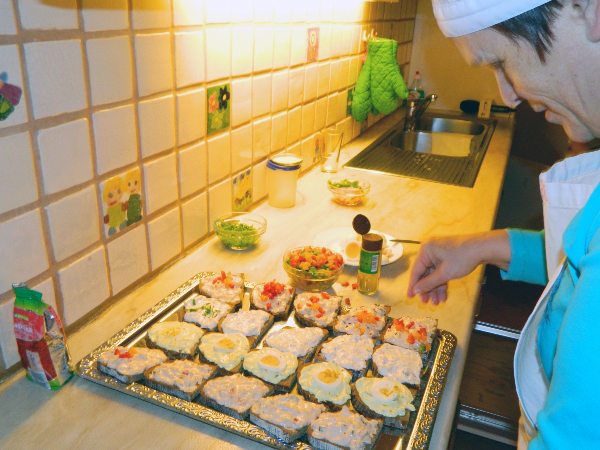 Die engagierten Mitarbeiterinnen und Mitarbeiter von Herrn Rettenwender zeigten zu Beginn ihre Kochkünste. Es wurden Eier-, Thunfischaufstrich und Liptauer zubereitet. Die selbstgebackenen Muffins bestreute man noch mit Zucker und das „handgemachte“ Kleingebäck wurde in Transportboxen gepackt. Die Begeisterung der Köchinnen und Köche am Arbeiten mit Lebensmitteln war unübersehbar.