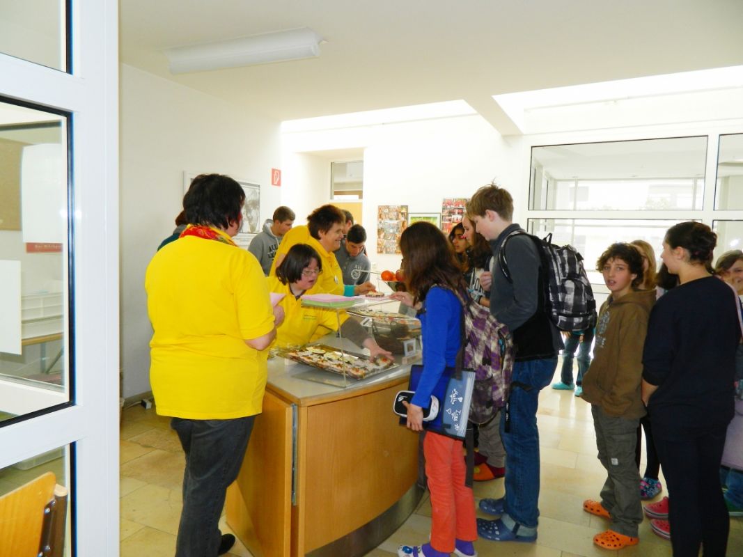 Nach einem kleinen Interview zum Thema „Fokus Ernährung“, moderiert durch Daniela Krispler, machten wir uns alle Richtung MHS Radstadt auf, wo uns bereits Ingrid Bogensberger (Direktorin-Stellvertreterin) und Interview-„gebriefte“ Schülerinnen und Schülern erwarteten. Während die fleißigen Mitarbeiterinnen und Mitarbeiter der Lebenshilfe Radstadt das Buffet aufbauten, wurde die Direktorin Sigrid Lanschützer zu einem kurzen Gespräch vor die Kamera gebeten. Als dann die Pausenglocke summte, gab es für die zahlreichen Schülerinnen und Schüler kein Halten mehr.