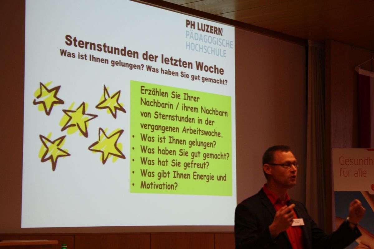 Unter dem Motto „PädagogInnengesundheit im Fokus“ stand die diesjährige Tagung für GesundheitsreferentInnen am 4. November 2015 im Heffterhof Stadt Salzburg. Dr. Beate Stolzlechner (Gesundheitsförderungsfonds Salzburg) und Prof. Mag. Johannes Plötzeneder (Amtsführender Präsident Landesschulrat für Salzburg) begrüßten 110 Pädagogen und Pädagoginnen aller Schultypen aus dem Bundesland Salzburg. Mit einem Impulsvortrag am Vormittag zeigte Titus Bürgisser (PH Luzern, Zentrum für Gesundheitsförderung), Möglichkeiten und Wege, was alle an der Schule beteiligte Personen beitragen können sowie welche Strategien Berufsleute anwenden, um weiterhin gesund und gerne in der Schule zu arbeiten. Ingo Vogl verarbeitete die Inhalte in seinem Kabarett und stärkte dabei eine wesentliche personale Ressource – den Humor. Denn Lachen ist ja bekanntlich die beste Medizin.