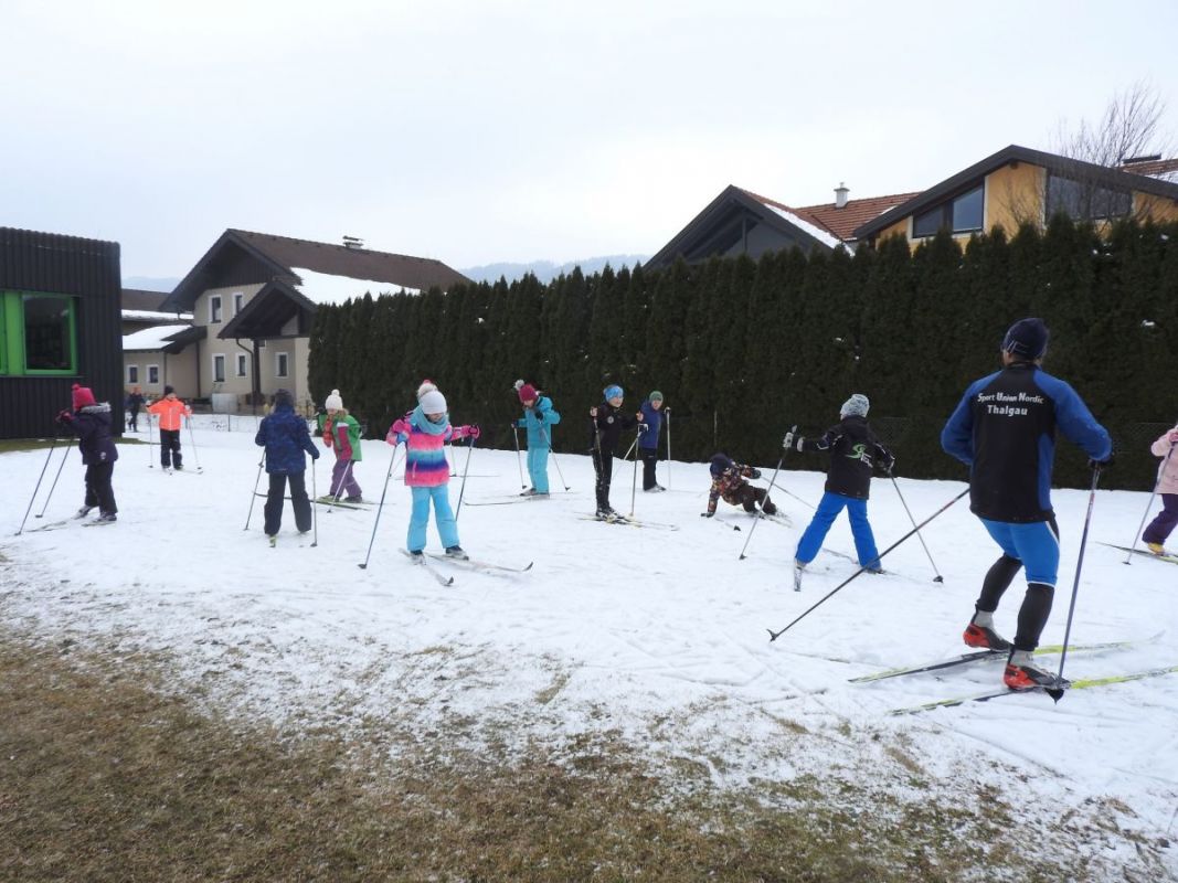 Bereits gut etabliert hat sich das jährliche Langlauftraining mit dem Thalgauer Langlaufverein. Die heurigen Schneeverhältnisse ermöglichten ein Training im Schulgarten. Dazu wurden alle Langlaufskier der VS und NMS geordnet in der Aula aufgelegt. Jede Klasse konnte sich für die Kinder passende Schuhe und Ski nehmen. Mit Skihose und gut eingepackt ging es bei eisigen Temperaturen nach draußen. David Grubinger organisierte die Trainingseinheiten und gemeinsam mit seinem Team zeigten sie den jungen Sportlern wie es geschickt mit den dünnen langen Brettern über Hindernisse, den Hügel hinauf und hinunter und durch Mulden geht. Spiele und lustige Geschicklichkeitsaufgaben führten zu den ersten Langlaufschritten. Zum Schluss liefen die Kinder bereits flott die ganze länge im Schulgarten entlang, von Volksschule bis Kindergarten und wieder zurück.