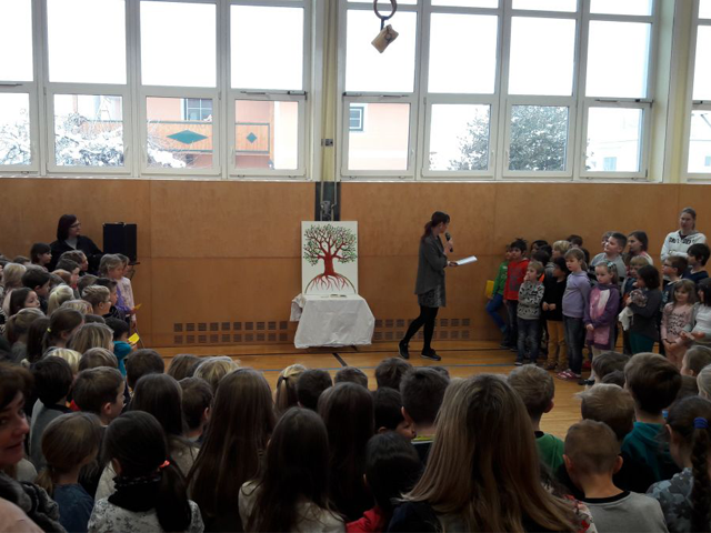Bei der Präsentation verlasen die Kinder ihre Ideen für ein gutes Zusammenleben und ihre Beobachtungen von bereits bestehenden schönen Begebenheiten im Schulalltag.