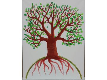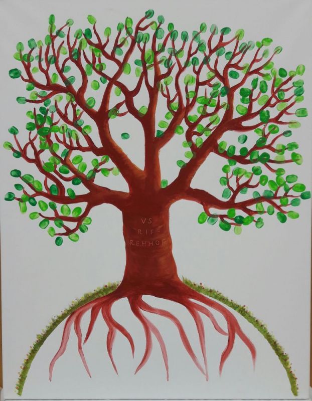 ein Baum ergrünt durch die Fingerabdrücke jedes einzelnen Kindes und jeder Lehrperson.