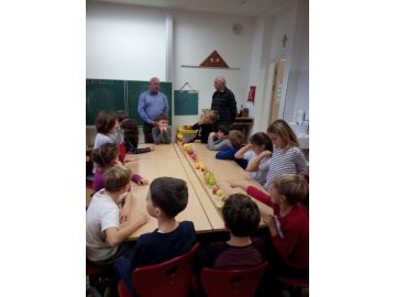 Am 13.11.2017 war der Gartenbauverein bei uns in der Schule. Wir waren gerade mitten unterm Lernen, da waren sie da. Alle Arten, die sie mit hatten, waren auf einer Stange montiert. Auf der Stange waren nicht nur Äpfel sondern auch Birnen und eine Quitte. Sie haben uns ganz viel über Äpfel erklärt und erzählt. Zwei Männer und eine Frau haben uns erklärt, dass wenn ein Apfel eine Warze hat, man diesen trotzdem essen kann. Es waren die Äpfel Jona, Prinz (gemeint ist: Prinz Rudolf), Blutbirne, Jonathan, Schweizer Hose, die Gräfin von Paris, Speierling und der Rosmarin (eigentlich: Salzburger Rosemarie) dabei.
