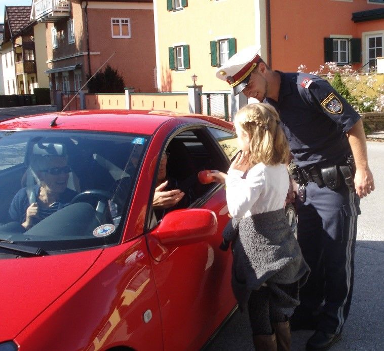 Bei dieser Aktion überprüften die Kinder gemeinsam mit einem Polizisten oder einer Polizistin in einer 30 km/h oder 50km/h Zone entlang der örtlichen Schulwege die Geschwindigkeit. Die Autolenker die sich positiv daran hielten, wurden mit einem Apfel belohnt. Für jene hingegen, die die vorgeschriebene Geschwindigkeit überschritten, gab es eine Zitrone.