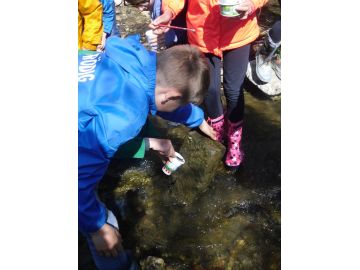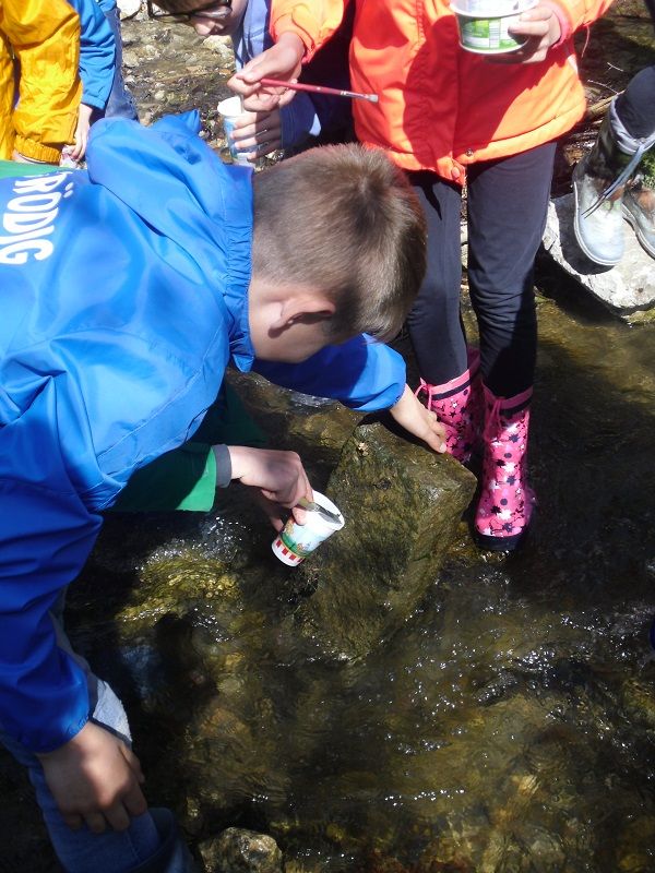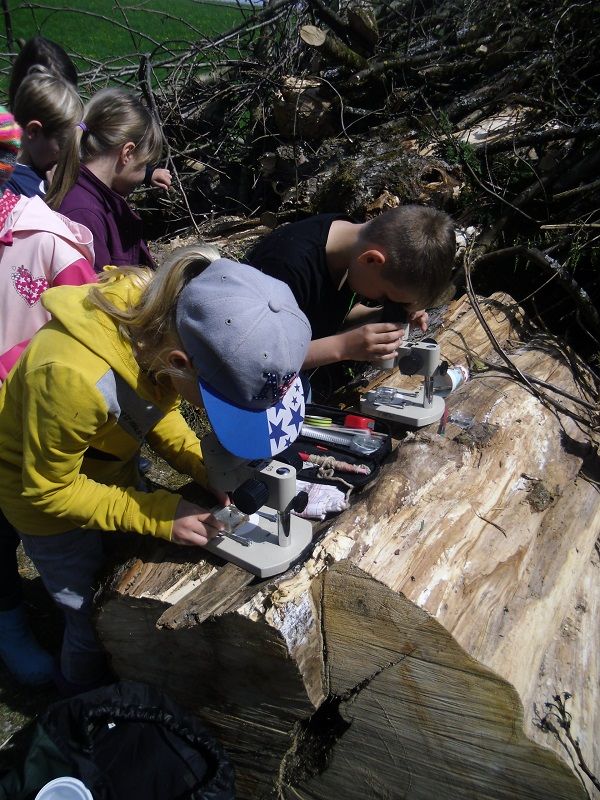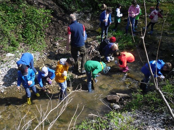 Wir bastelten gemeinsam einen Wasserkreislauf und wanderten danach zum Mesnerbach hinter unserer Schule, wo wir uns, ausgerüstet mit Pinzetten, Pinseln, Bechern und zwei Mikroskopen auf die Suche nach Leben im Wasser machten.